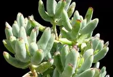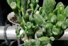 筒叶花月,是景天科青锁龙属的多年生草本植物。植株多分株,灌木状,茎较粗壮,圆柱形,表皮灰褐色;叶片肉质,互生,呈圆筒状,簇生于茎或分枝顶端,叶端呈斜截形,截面为椭圆形;花呈星状,淡白色;花期秋季。…全部>>