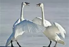 扁嘴天鹅:体长90-115厘米,体羽白色,羽端黑色,在飞行时则很明显。雁喙和脚红色。栖息于茂密的沼泽及湖泊,主要吃草及水生植物,也会吃蚌类及鱼类。分布于南美洲,…全部>>