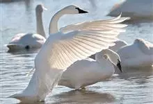 小天鹅为大型水禽,体长110~130厘米,体重4~7千克,雌鸟略小。它与大天鹅在体形上非常相似,同样是长长的脖颈,纯白的羽毛,黑色的脚和蹼,身体也只是稍稍小一些,颈部和嘴比大天鹅略短,但很难分辩。最…全部>>
