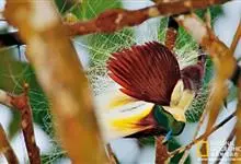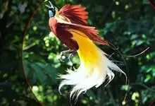 大极乐鸟是极乐鸟属中最大的鸟种。成年雄鸟体长可达到43厘米,雌性可达35厘米。雄鸟的额、颊、喉等墨绿色;头、颈黄色;上体暗赤栗色;腹部葡萄红色,胁部有长饰羽,其基部橙黄,中部黄色,…全部>>