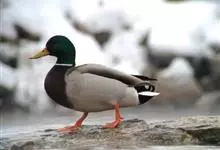 绿头鸭属游禽,大型鸭类。体长47-62厘米,体重大约1千克,外形大小和家鸭相似。雄鸟嘴黄绿色,脚橙黄色,头和颈辉绿色,颈部有一明显的白色领环。上体黑褐色,腰和尾上覆羽黑色,两对中央尾羽亦为黑色,且向…全部>>