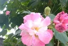 木芙蓉,锦葵科木槿属落叶灌木或小乔木。小枝上有细绒毛;叶片为卵状心形,托叶为披针形,常早落;花单生,花萼为钟形,花冠初为白色或淡红色,后逐渐变为深红色;果实为扁球形,有淡黄色的毛附着。花期8到10月。…全部>>