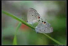长尾蓝灰蝶是灰蝶科的一种。 幼虫食用假地豆和显脉山绿豆;展翅约 25毫米;雌雄二型;四月至十二月可见。多在灌丛和废弃农地出现,飞行缓慢和接近地面,喜欢访花。雄蝶有群集吸水的习性。…全部>>
