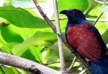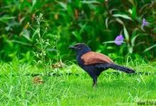 褐翅鸦鹃,是鹃形目鸦鹃科鸦鹃属的鸟类。褐翅鸦鹃的身体为黑色;头颈和胸带蓝紫色金属光泽并具黑亮的羽干纹,下胸至腹部泛金属绿光泽;两翼和肩部为棕栗色,外侧飞羽具暗色羽端,尾羽闪铜绿色光泽;虹膜赤红色,…全部>>