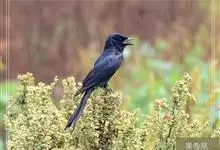 黑卷尾是雀形目卷尾科一属,又称铁练甲、铁燕子、铁林哥、羊蹄刺、榨油郎,体长约30厘米全身蓝黑色而具金属光泽,尾长且分叉较深。幼鸟似成鸟,金属光泽弱,下腹部具近白色的横纹。虹膜暗红色,嘴黑色,脚黑色。…全部>>