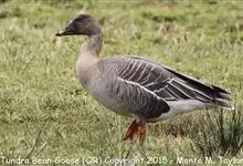 豆雁,雁形目鸭科。成鸟头、颈、背灰褐色,带淡黄色羽缘;尾上覆羽白色,尾羽黑褐色带白端,故飞行伸展时可见尾基和尾端各有一条白色弧线;翼上覆羽灰褐色,初级覆羽深黑灰色带黄白色羽缘,…全部>>