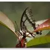 大二尾蛱蝶两翅正面黑色,中域有一浅绿色大型宽带纹,两翅反面浅绿色,中域有一缀黑边的褐色弧纹,亚外缘还有一深褐色横纹,后翅各有尾突两条,…全部>>