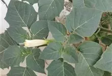 洋金花是茄科曼陀罗属植物,一年生草本植物,全株近于无毛。茎直立,圆柱形,高30~100cm,基部木质化,上部呈义状分枝。叶互生,上部的叶近于对生;叶柄长2~6cm,表面被疏短毛;叶片卵形、长卵形或心形,…全部>>