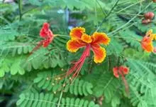 洋金凤 Sw.),豆科小凤花属灌木状或小乔木植物,枝无毛,绿或粉绿色;二回羽状复叶;总状花序伞房状,萼片无毛,花瓣橙红或黄色,圆形,花丝红色,子房无毛,花柱橙黄色;荚果窄而薄,…全部>>