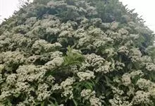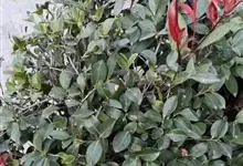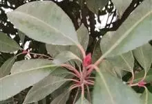 石楠 Kalkman),是蔷薇科石楠属的常绿乔木,高5~12米,株型紧凑,树冠圆球形。树枝为褐灰色;鳞片为褐色,没有毛;叶片革质,长椭圆至侧卵状椭圆形,有锯齿,新叶红色光亮。复伞房花序,白色小花,…全部>>