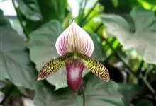 兜兰是兰科兜兰属的多年生草本植物。根茎粗状,直径3~4毫米,有很多须根;叶基生,叶片肉质增厚,排成紧密2列,叶片呈长圆形,表面有极短柔毛;总状花序,粉白色,花葶直立或倾斜,深绿色或褐色,花瓣大,呈唇形,…全部>>