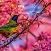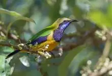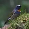 橙腹叶鹎体形大小和金额叶鹎相似,体长16~20厘米。额至后颈黄绿色,其余上体绿色,小覆羽亮钴蓝色,形成明显的肩斑。颏、喉、上胸黑色具钴蓝色髭纹,其余下体橙色。飞羽和尾羽雄鸟黑色、雌鸟绿色。…全部>>