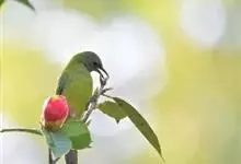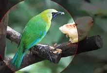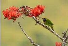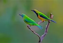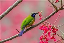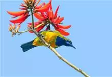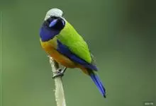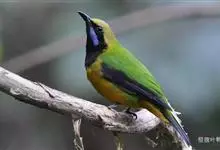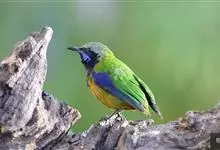 橙腹叶鹎体形大小和金额叶鹎相似,体长16~20厘米。额至后颈黄绿色,其余上体绿色,小覆羽亮钴蓝色,形成明显的肩斑。颏、喉、上胸黑色具钴蓝色髭纹,其余下体橙色。飞羽和尾羽雄鸟黑色、雌鸟绿色。…全部>>