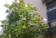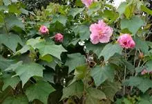 木芙蓉,锦葵科木槿属落叶灌木或小乔木。小枝上有细绒毛;叶片为卵状心形,托叶为披针形,常早落;花单生,花萼为钟形,花冠初为白色或淡红色,后逐渐变为深红色;果实为扁球形,有淡黄色的毛附着。花期8到10月。…全部>>