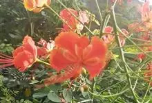 洋金凤 Sw.),豆科小凤花属灌木状或小乔木植物,枝无毛,绿或粉绿色;二回羽状复叶;总状花序伞房状,萼片无毛,花瓣橙红或黄色,圆形,花丝红色,子房无毛,花柱橙黄色;荚果窄而薄,…全部>>