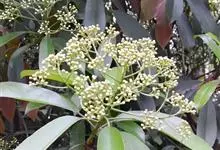 石楠 Kalkman),是蔷薇科石楠属的常绿乔木,高5~12米,株型紧凑,树冠圆球形。树枝为褐灰色;鳞片为褐色,没有毛;叶片革质,长椭圆至侧卵状椭圆形,有锯齿,新叶红色光亮。复伞房花序,白色小花,…全部>>