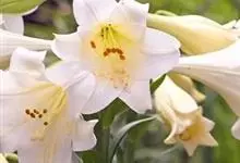 麝香百合:在中国台湾亦称铁炮百合。鳞茎球形或近球形,高2.5-5厘米;鳞片白色。茎高45-90厘米,绿色,基部为淡红色。叶散生,披针形或矩圆状披针形,两面无毛。花单生或2-3朵;花喇叭形,白色,筒外…全部>>