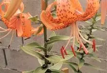 卷丹是百合科百合属植物。鳞茎近宽球形,鳞片宽卵形,呈白色;茎带紫色条纹,具白色绵毛;叶散生,矩圆状披针形或披针形,两面近无毛,先端有白毛,边缘有乳头状突起,上部叶腋有珠芽;花下垂,花被片披针形,…全部>>