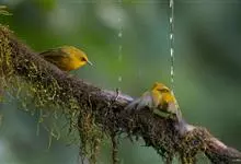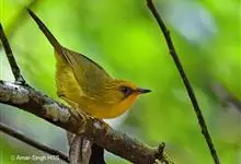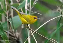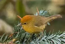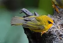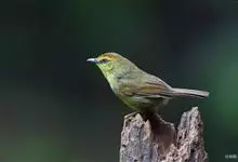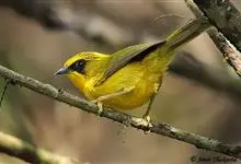 金头穗鹛小型鸟类,体长10~11厘米,是一种黄色小鸟。头顶金黄色有黑色纵纹,眼先黑色,在头、颊和耳羽金黄色的衬托下亦甚醒目。上体橄榄黄色,下体亮黄色,腹和两胁沾绿。…全部>>