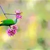 橙腹叶鹎体形大小和金额叶鹎相似,体长16~20厘米。额至后颈黄绿色,其余上体绿色,小覆羽亮钴蓝色,形成明显的肩斑。颏、喉、上胸黑色具钴蓝色髭纹,其余下体橙色。飞羽和尾羽雄鸟黑色、雌鸟绿色。…全部>>
