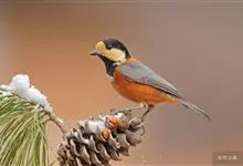 杂色山雀,是山雀科山雀属的一种动物。体重17-18克,体长125-140毫米。雌雄羽色相似。额、眼先、耳羽至颈侧乳黄色,头顶至后颈黑色,后头中央有一白斑。上背栗色,上体余部及翼蓝灰色。颏、喉黑色,…全部>>