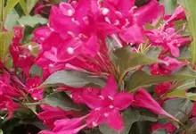红王子锦带花是忍冬科锦带花属的落叶开张性灌木。株高1 -2米;嫩枝淡红色,老枝灰褐色;单叶对生,呈椭圆形,先端渐尖,叶缘有锯齿,红枝及叶脉具柔毛;花冠漏斗状钟形,花冠筒中部以下变细,聚伞花序,…全部>>