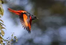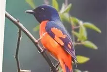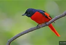 灰喉山椒鸟:共有8个亚种。体长18-22厘米。雄鸟头部和背亮黑色,腰、尾上覆羽和下体朱红色,翅黑色具一大一小的两道朱红色翼斑。中央尾羽黑色,外侧尾羽基部黑色,端部红色。…全部>>
