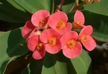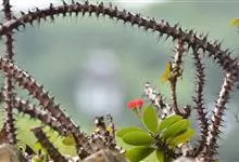 铁海棠为大戟科大戟属蔓生灌木植物;茎多分枝,具纵棱,呈旋转状;叶互生,通常集中于嫩枝上;每个花序基部边缘具微小的红色尖头;苞叶先端圆且具小尖头,无柄,上面鲜红色,下面淡红色;苞片丝状;子房光滑无毛,…全部>>