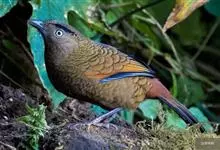 蓝翅噪鹛:噪鹛科、彩翼噪鹛属动物。中型鸟类,体长22-25厘米。上体棕橄榄褐色密被黑色鳞状斑,眼蓝白色,眼上有一长而宽阔的黑色眉纹,从眼先直到颈侧。下体棕褐色被黑色鳞状斑;尾上和尾上覆羽栗色,…全部>>