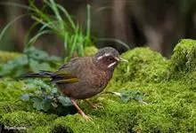 玉山噪鹛中等体型的褐色鸟类。白色长眉纹及髭纹显著;顶冠灰而具白色的鳞状斑纹;脸侧及颏褐色,喉及颈背褐色并具灰色羽缘而成的鳞状纹。腹部灰,臀栗色。两翼及尾青石蓝灰,外侧羽羽缘黄褐,初级飞羽羽缘黄褐。…全部>>