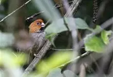 点胸鸦雀是莺科、鸦雀属小型鸟类,体长18-21厘米。头顶至枕橙棕色,嘴橙黄色、短而粗厚,脸皮黄色,耳覆羽和颊后部黑色,眼圈白色。上体棕褐色。颏黑色,其余下体淡皮黄白色,喉和上胸具黑色矢状斑。…全部>>
