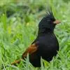 凤头鹀:属小型鸣禽,体重21-31克,体长134-175毫米。以头顶的细长羽冠为特征,雄鸟全身几乎均为黑色具蓝色光泽,两翅和尾以及尾上覆羽栗红色。雌鸟具短的褐色羽冠,上体暗橄榄褐色,…全部>>