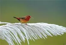 红梅花雀小型鸟类,体长9-10厘米。雄鸟通体朱红色,背、肩、胸等满布白色小斑点,两翅和尾黑褐色均具白色端斑,嘴红色,脚蜡黄色。雌鸟上体淡褐色或赭褐色,翅上中覆羽、大覆羽和内侧飞羽末端具白色斑点,…全部>>