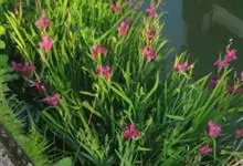 花菖蒲:是玉蝉花的变种。多年生宿根挺水型水生花卉。根状茎短而粗,须根多并有纤维状枯叶梢,叶基生,线形,叶中脉凸起,两侧脉较平整。花葶直立并伴有退化叶1-3枚。花大直径可达15厘米。外轮三片花瓣呈椭圆…全部>>