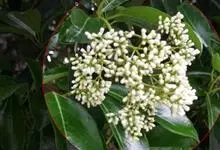 石楠 Kalkman),是蔷薇科石楠属的常绿乔木,高5~12米,株型紧凑,树冠圆球形。树枝为褐灰色;鳞片为褐色,没有毛;叶片革质,长椭圆至侧卵状椭圆形,有锯齿,新叶红色光亮。复伞房花序,白色小花,…全部>>