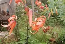 川百合:鳞茎为扁球形,白色。茎干绿色,上半部有小突起及稀疏的绵毛。叶片散生,为线状披针形, 边缘反卷并有明显的小乳头状突起,中脉明显,往往在上面凹陷,在背面凸出,叶腋有白色绵毛。花下垂,桔红色,花被…全部>>