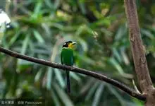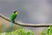 长尾阔嘴鸟是雀形目阔嘴鸟科的鸟类,体长约25厘米,是绿色阔嘴鸟。形长的楔形尾蓝色,喉及脸黄色,顶冠及颈背黑色。两翼黑并具显著的蓝色斑块。头顶具蓝色小点斑,眼后有一黄色点斑。亚成鸟多为绿色。结群活动于…全部>>