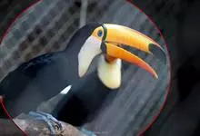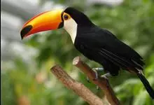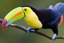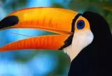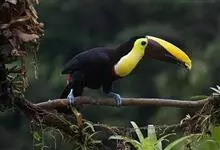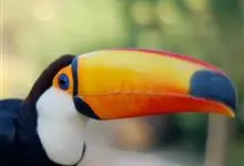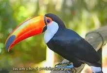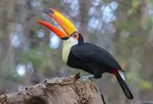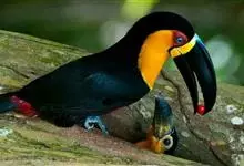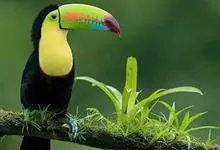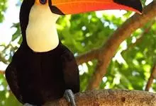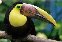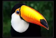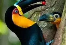 鵎鵼:又名巨嘴鸟。体长约67厘米,嘴巨大,长17~24厘米,宽5~9厘米,形似嘴刀。嘴非常漂亮,上半部黄色,略呈淡绿色,下半部呈蔚蓝色,喙尖点缀着一点殷红。眼睛四周镶嵌着天蓝色羽毛眼圈,胸脯橙黄色,…全部>>