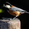 杂色山雀,是山雀科山雀属的一种动物。体重17-18克,体长125-140毫米。雌雄羽色相似。额、眼先、耳羽至颈侧乳黄色,头顶至后颈黑色,后头中央有一白斑。上背栗色,上体余部及翼蓝灰色。颏、喉黑色,…全部>>