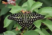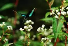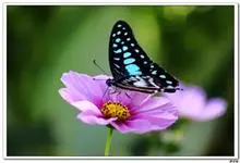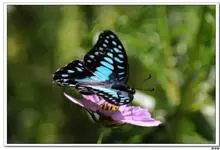 青带凤蝶Graphium sarpedon ,又名青凤蝶,是最普遍的中型凤蝶,飞行速度很快。青带凤蝶的翅膀中央有许多浅蓝色的斑点,很整齐地排列成一条直线。这些斑点由上而下逐渐变大,就像一条青色的带子。全部>>