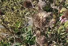 山牛蒡是菊科,山牛蒡属多年生草本植物,高可达1.5米。根茎粗壮。茎直立,单生,基部叶与下部茎叶有长叶柄,叶柄有狭翼,叶片心形、卵形、宽卵形、卵状三角形或戟形,不分裂,全部叶两面异色,上面绿色,…全部>>