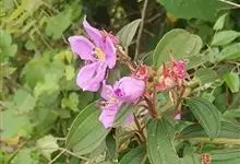 野牡丹:灌木,高0.5-1.5米,分枝多;茎钝四棱形或近圆柱形,毛扁平边缘流苏状。叶片坚纸质,卵形或广卵形,全缘,7基出脉,两面被糙伏毛及短柔毛。伞房花序生于分枝顶端,近头状,…全部>>