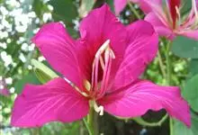 红花羊蹄甲,为豆科羊蹄甲属植物,别名艳紫荆、洋紫荆。半落叶乔木,高达了~10 m,叶草质,近圆形或阔心形,长8~13cm顶端开裂至全叶长1/4~13,裂片顶端圆。总状花序顶生或腋生,花冠紫红色,…全部>>