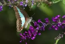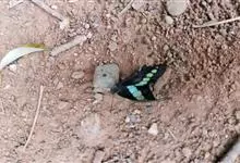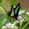 青带凤蝶Graphium sarpedon ,又名青凤蝶,是最普遍的中型凤蝶,飞行速度很快。青带凤蝶的翅膀中央有许多浅蓝色的斑点,很整齐地排列成一条直线。这些斑点由上而下逐渐变大,就像一条青色的带子。全部>>