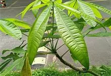 瓜栗 Walp. ),俗称发财树,木棉科小乔木,高4-5米,树冠较松散,幼枝栗褐色,无毛。小叶具短柄或近无柄。花单生枝顶叶腋;花梗粗壮,被黄色星状茸毛,脱落;萼杯状,近革质;花瓣淡黄绿色,狭披针形…全部>>