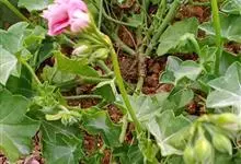 蔓性天竺葵学名盾叶天竺葵 Ait.)是牻牛儿苗科天竺葵属植物。多年生攀缘或缠绕草本,长40-100厘米,茎具棱角,多分枝,叶互生,略呈肉质,伞房花序腋生,有花数朵,花冠洋红色,上面2瓣着深色条纹,…全部>>