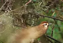 白颊噪鹛是雀形目噪鹛科噪鹛属鸟类,又称土画眉、小画眉、小噪鹃。成鸟额至头顶栗褐色,长眉纹、眼先和颊纹棕白色,眼后至耳羽深褐色,…全部>>
