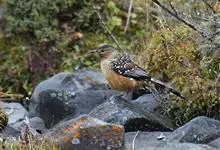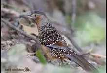 大噪鹛:中型鸟类,体长32-36厘米。额至头顶黑褐色,背栗褐色满杂以白色斑点,斑点前缘或四周还围有黑色。初级覆羽、大覆羽和初级飞羽具白色端斑。尾特长,均具黑色亚端斑和白色端斑。颏、喉棕褐色,…全部>>
