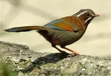 玉山噪鹛中等体型的褐色鸟类。白色长眉纹及髭纹显著;顶冠灰而具白色的鳞状斑纹;脸侧及颏褐色,喉及颈背褐色并具灰色羽缘而成的鳞状纹。腹部灰,臀栗色。两翼及尾青石蓝灰,外侧羽羽缘黄褐,初级飞羽羽缘黄褐。…全部>>