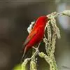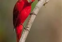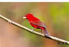血雀雀科朱雀属鸟类,体重36-49克;体长155-182毫米。雄鸟除眼先、翼与尾为黑色外,通体为鲜红色;嘴鲜黄;雌鸟暗橄榄绿色,羽端较淡或带黄色;腰鲜黄;嘴较暗。虹膜褐色;嘴黄色;腿和脚褐色。…全部>>